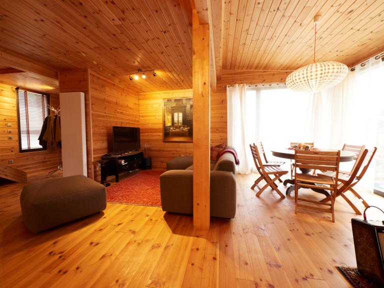This contemporary family home is a combination of our Post & Beam and log home systems. The external walls are built with our laminated log and the load bearing structures is built with our post & beam structure.